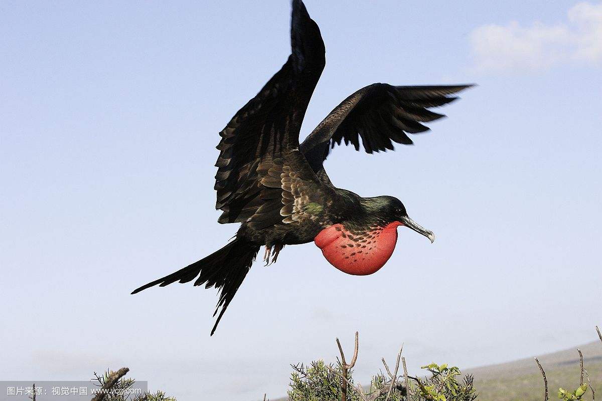 军舰鸟喜欢深红色喉囊。雄鸟具有一个皮肤裸露的喉囊,求偶时会鼓起并呈鲜红色(是不是有种似曾相识的感觉?),以此吸引雌鸟的眼球。雄性军舰鸟会在雌鸟们在头顶上方飞行时进行求偶表演,希望其中有一只识货的能飞下来与之交配。雄鸟具有一个皮肤裸露的喉囊,求偶时会鼓起并呈鲜红色(是不是有种似曾相识的感觉?),以此吸引雌鸟的眼球。雄鸟还会将翅膀伸展开来,振动鸟喙,发出类似击鼓的声音,显然这也很具有吸引力。有时候,雄性军舰鸟还会发出口哨声。