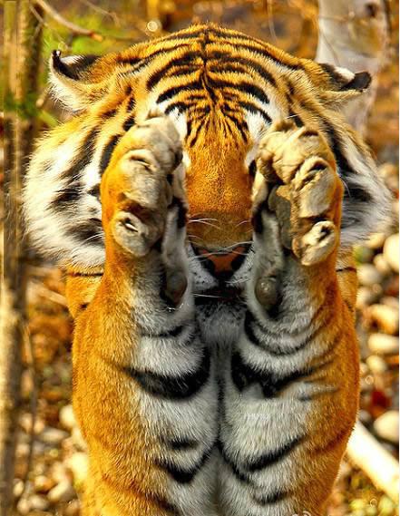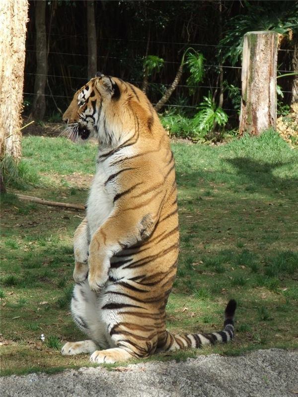 3.老虎这样的站立姿势是不是很像一只猫咪?没想到,体型相差几百倍的老虎和猫咪做出的动作竟然如出一辙,不过,猫咪是小乖,老虎是巨乖。