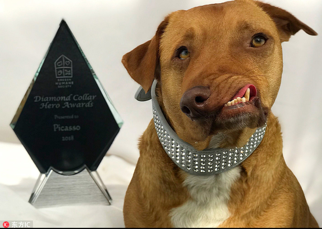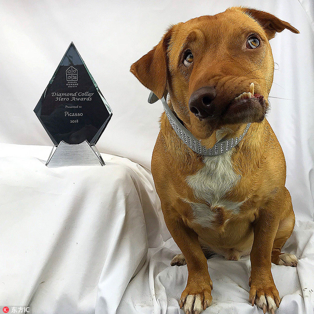 居住在美国加州的明星小狗毕加索(Picasso)近日荣获了俄勒冈州人道协会颁发的钻石英雄奖。