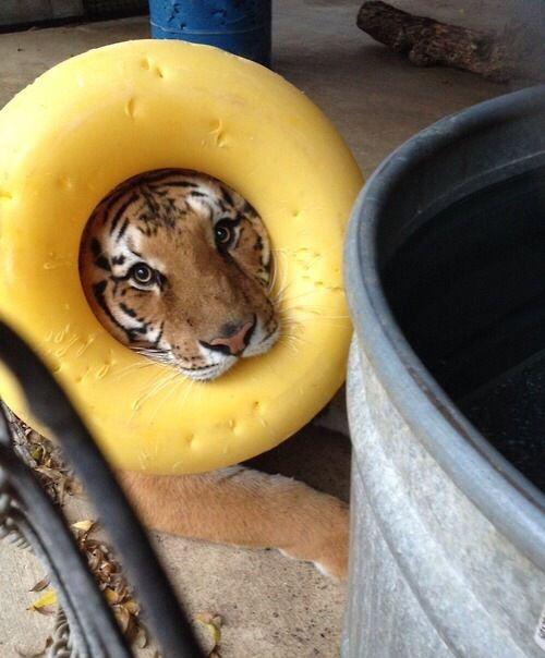 2.在一个动物园里,一只小老虎的头不小心被橡胶圈卡住了。工作人员帮忙把橡胶圈取了下来,结果没过多久,这只小老虎又把橡胶圈戴头上了像不像你家那只淘气又爱搞事情的猫咪呢?