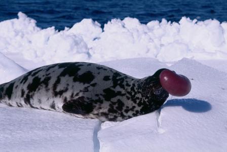 冠海豹脸上的气球。又是一种通过器官膨胀来吸引异性的动物。雄性冠海豹头上的冠更确切地说是富有弹性的鼻腔。这个凸出的附属器官能膨胀得像个气球一样,覆盖在雄性冠海豹的脸上。通过该物体的膨胀和收缩,雄性冠海豹能在水下发出声音信号,不过,它最主要的功能还是作为雄性的性征。有时候,气球会有一小部分从其中一只鼻孔里冒出来,使雄性冠海豹显得更有魅力,并且使它们发出的声音更为迷人对雌性而言,在人类听来就完全不一样了。
