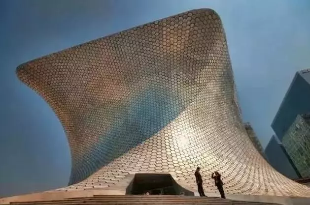 14.墨西哥Soumaya博物馆 这座博物馆是一个有机的多维建筑,不透明的外墙用大量六边形的铝制模块搭建,看上去有点像古代武士的锁子甲,独特的形状造就了其强大的存在。
