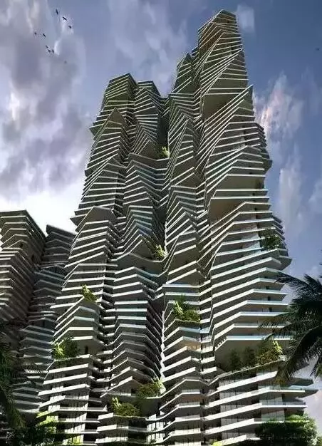9.台北扭曲的绿色建筑,外形像两只交叉在一起双手。中心部位又称悬浮花园,上面种有蔬菜等植物,居住这里40户壕们可以享用到自己种植的果蔬。