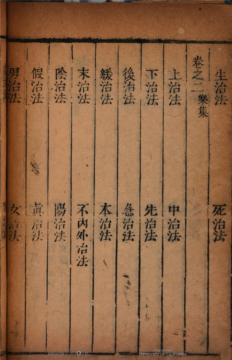 《石室秘录》是中医古籍中唯一一部以治法为主要内容和标目的著作。全书分6卷,依次分为礼、乐、射、御、书、数六集,各集之中以治法为目。其中,礼集中载14种治法,乐集载30种治法,射集中载39种治法,御集中载33种治法,书集中载12种治法和17论,数集中载有7大类疾病(7门)和16种杂病。全书论述总计128法、17论、7门、16杂病,内容闸述了内、外、妇、儿、五官等100种左右疾病的证治,收古今成方及作者自定方500余首,其中大多处方为白裁,是中医古籍中理论联系实际、理法方药俱备的治法专著。
