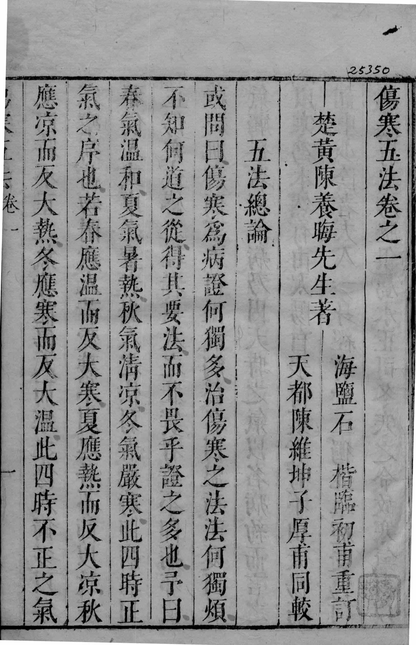 夫索籥於天地之间者,其惟阴阳乎,阴之於人為血,阳之於人為气,而究五六之乘除者,第言运气而不言血何也,盖血得气以成质,其于气也有二,名无两体也,纬书之言曰,有生皆在气中,善夫益气之在六合也,氤氲而无形,薰蒸而善变,其於大块之噫也,為风亦然,歧伯对轩皇云,每太乙移宫之日,天必应之以风,风因气以周流,气随风以贞慝,百病之原皆风之所為,即气之所為也,予少孤闻见謭劣弱冠漎大人先生逰微识圣贤性命之旨,与子舆之言养气憮然叹曰此仙道也,气功可易淂哉,私计通此道者,宜莫如医,於是取方书脉经俛首循习,而苦於术之无奇也,走远方以那之,西入秦闻亲豊镐之胜,北游幽蓟揽都会之雄,南浮湘元窥庐之秀,东趋吴越覩溟渤之竒,慨然有悟,四海之内如人有身,自泥丸而絳宫,由尾阁而涌泉,亦若是矣,厯年以来,屡遇至人教以内修之法,试之輙効,扵以治病气功与药味兼用,又无不奇中者,至伤寒一证,自仲景立论,后业此道者更僕难数,然扵阴阳二证汗吐下三法未尽淂肯綮若言约意明决病如覩黑白,惟有五法一书,惜未知欷自何人,淂之如获异寳,携至白下晤筠倩雷先生一见,欣然以為古人云,不為名相则為名医,医术之於阴阳,奚殊变理哉,且為子者不知医不可言孝,為臣者不知医不可言忠,是书也,是躋世於寿者也,私之可乎哉,且一人所手起者,寧几固不若此书之傅遍天下,及后世也予唯唯,遂詮次恭以闻俾淂成帙,付之剖劂以公诸世之為人医而医人者。