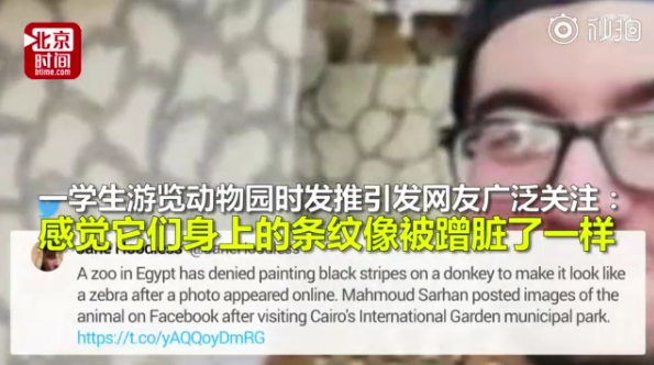 见过斑马的人如果细心观察一定能够看出区别,但是这家动物园的化妆技术确实有点高超,之前的游客全部没有发现,直到昨天这名埃及学生哈茂德萨尔汉的到来,才从驴子脸上的墨迹发现异常。哈茂德萨尔汉昨天到开罗国际花园市政公园游玩,在游玩的的过程中正好到动物园参观,没想到却给了他一个意外的发现,他发现一只斑马的动作行为非常奇怪。