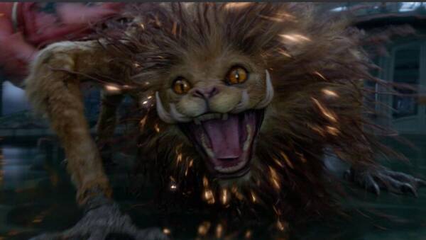 而在《神奇动物在哪里2》当中,驺吾的形象可以说十分具有中国特色了:驺吾的眼睛与动作,还有纽特用来安抚驺吾的道具,都带有中国传统文化舞狮的影子。而在为驺吾解开锁链的箱子地下室场景中,我们也能看到驺吾所处的地方是一片经典的中国山水。值得注意的是,这是中国文化第一次,用如此明显的方式在JK罗琳笔下的魔法世界正式登场。