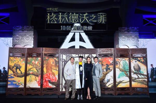 入乡随俗,宣传当然少不了中国元素。相信大家已经看到了,菌菌所说的就是演员们身后这扇屏风。