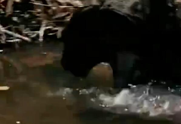 森蚺想逃到水里去,但是老虎一下扑了上去,并紧紧的咬住森蚺。