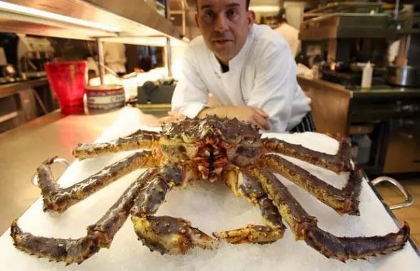 红王蟹的学名叫堪察加石蟹,重量可达10公斤,巨大的钳子能一下夹掉人的手指。展开身长1.5米、重达10公斤的红王蟹能够给海洋世界里的其他生物带来巨大的灾难。红王蟹成群结队,疯狂吞吃蛤和各种贝类动物,也吃海藻、死鱼和鱼卵。
