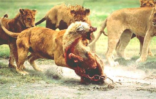 鬣狗被狮子群缠上,可算是倒霉到家了,狮子怎能放过碍眼的鬣狗,所谓的眼中钉是不入狮子的眼,一般情况下鬣狗被咬死结束。