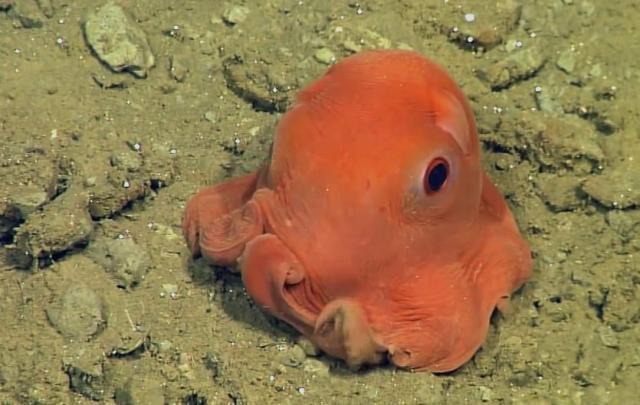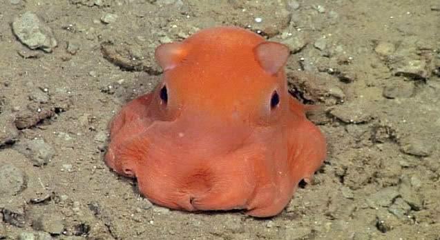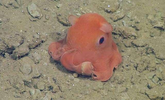 它的外形十分之萌,身体直径约18公分,通体粉红,长着像「小精灵」一样的大眼睛,头上还长着像翅膀一样的鳍,8条触手张开之后,看上去就像是一顶在水中张开的降落伞。