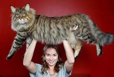 缅因猫的是家猫中体型最大的猫,平均体重可达15~25磅,体长可达到120cm左右,身高也比其他的猫要高一些。它们肌肉发达,体格健硕,脚掌大而圆,是捕猎的好手。但是缅因猫发育较慢,一般需要3?5年才会完全发育成熟。2010年世界上最长的猫Stewie申请了吉尼斯世界纪录,从它的鼻子尖到尾巴尖测量,它的体长达到了123cm。