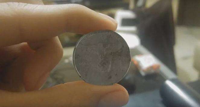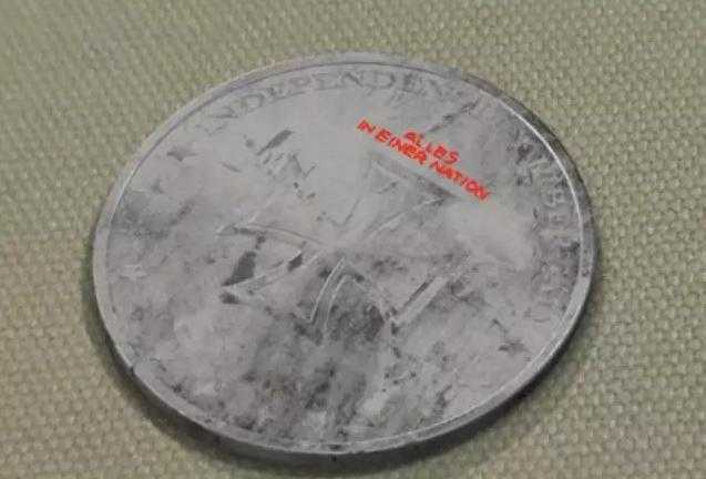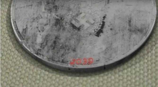 西班牙考古学家德瓦伦西接过硬币仔细鉴别后发现,在硬币的一面印着纳粹党的象征标志图案卍字鹰以及一个单词:NuevaAlemania,而这个单词的意思是德文新德国的意思。在硬币的另一面印着纳粹的另一个标志图案十字,并印着一行小字Alies in einer nation,这行小字的德文意思是所有国家都在一个国家之中。这件事非常奇怪,考古学家随后将这枚硬币做了录像,并放到了网上。