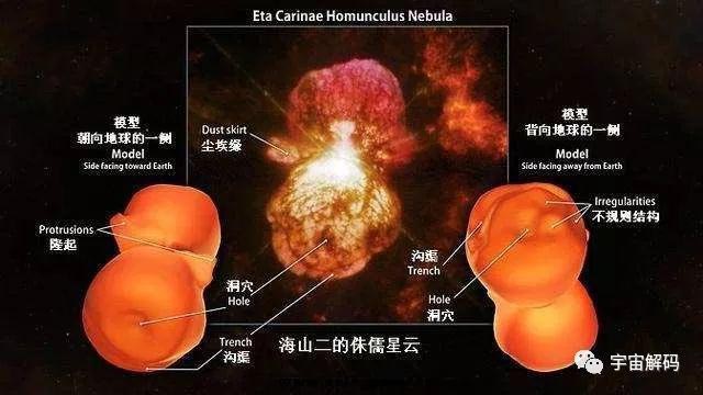 宇宙中没有废物,但是恒星的质量有一个上限。17世纪时,埃德蒙哈雷跨过赤道,绘制南方的星座图,海山二看上去只是一颗暗星。但到了1843年,海山二突然变成了天空中第二亮的星星,只比天狼星稍暗,从此开始爆发。那个哑铃状的云团就是爆发的膨胀残余,中心是一颗疯狂的恒星。