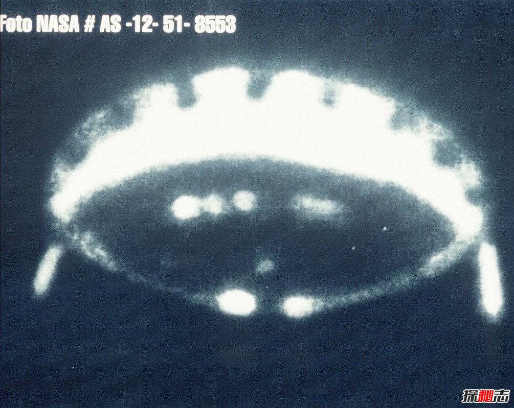 下一张照片展示了一个直径数百英尺的神秘圆盘形物体。当宇航员进入月球表面时所拍到的。详细