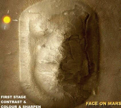 美国火星探测器海盗1号在火星上不仅发现了河道,也发现了一个巨大的人脸建筑,被人们称为神秘的人脸。 通过计算机对照片的处理分析,发现这张人脸是修筑在一个巨大的长方形台基上的,有鼻子、眼睛和嘴巴,外形与地球人脸 极为相似,该建筑物长26 km,宽23 km。从海盗1号以不同角度拍摄的多幅照片上可以清楚地看出,略微有些变化,从其他角度看似乎有点人脸的特征,