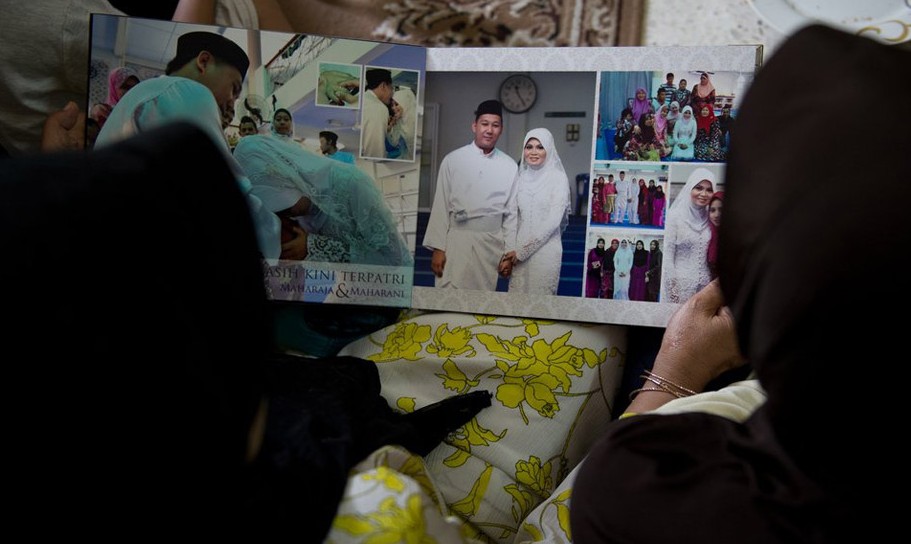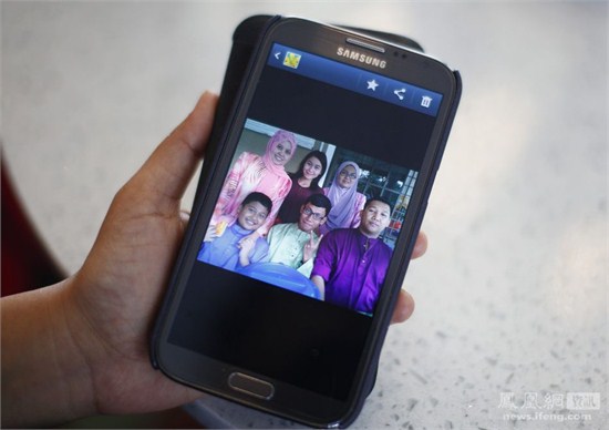 36岁的Arni Marlina是马航失联航班乘客的家属。她展示了手机上存储的一张家庭合照,这张照片拍摄于2014年3月布城的一家宾馆。Marlina的兄弟24岁的Razahan Zamani(照片右下角)和他33岁的妻子Norli Akmar Hamid搭乘失联航班去度蜜月