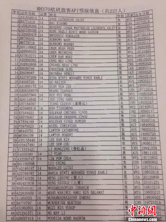 马航失联客机MH370航班中国乘客名单公布
