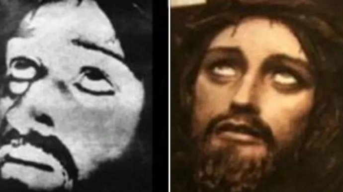 (通过The Chronovisor看到的耶稣受难画面和现今的想象图对比)