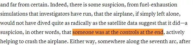 在《大西洋》的最新报道中,有一个点也被提到:从调查人员进行的飞机燃料耗尽模拟来看,如果飞机是在无人驾驶状态下飞行,并不会像卫星数据显示的那样,彻底地坠入海中。