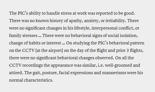 甚至是在马来西亚官方针对马航MH370失踪后的调查报告中,Zaharie被认为能很好处理工作压力,并且没有冷漠、焦虑、烦躁等情绪问题,生活方式简单,家庭和谐,人际关系良好