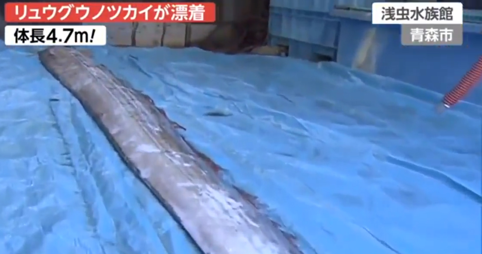 渔民周日(2日)在青森县岸边发现的皇带鱼身长4.7米,当时它已经死亡。渔民拍片后将该条皇带鱼送交当地水族馆保存,以便制成标本供大学研究。