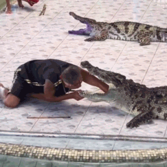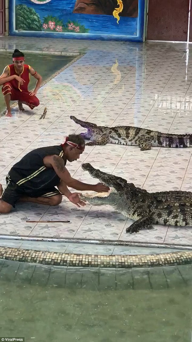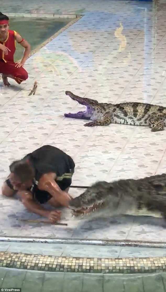 当时在场大约有100名观众。随后驯兽师努力将胳膊从鳄鱼嘴里挣脱了出来。