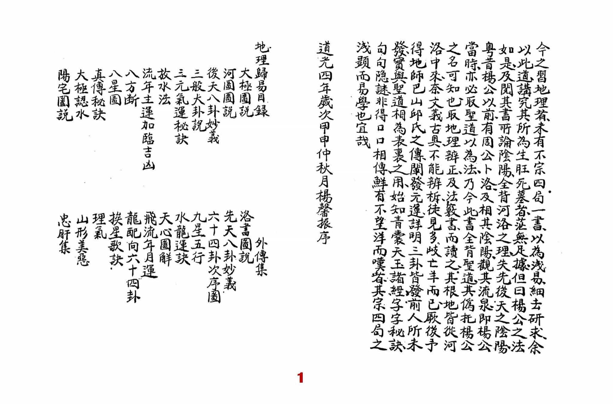 三元地理归易《三元归易秘宗》,清杨馨振撰,道光四年岁次甲申仲秋月抄录。全本共63个双面,合计126页。