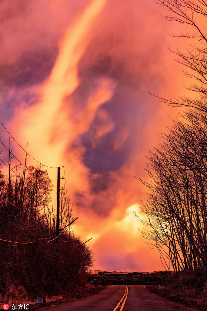 熔岩柱在公路尽头翻滚,熔岩上方火焰滚滚升腾,形成一道龙卷风,照亮了整个天空,画面十分惊险。