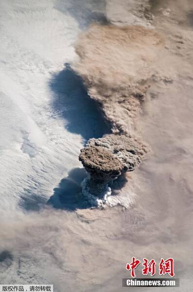 图为千岛群岛的萨瑞彻维火山喷发场景,火山喷发出的火山灰将云层蚀出一个大洞