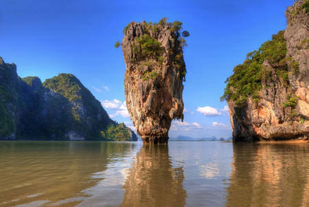 这是位于泰国一座岛上的石头,上大下小,直直的插入水里。
