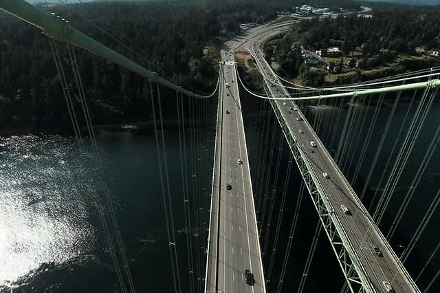 ▲新建的塔科马海峡吊桥和平行桥。图据bechtel