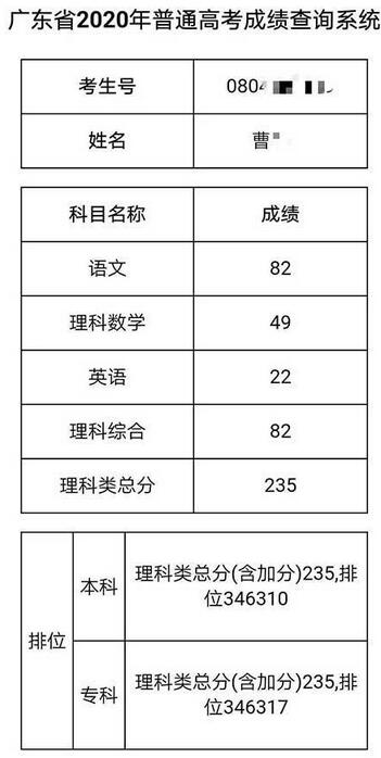 网传图片显示,曹某实际分数语文82分、数学49分、英语22分、理综82分,总分235分。陈某汉称,通过教育系统查分,曹某实际高考分数确为235分。