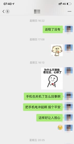 王先生在22日下午16点22分曾给女友发消息询问返程没有,但未收到回复。他最初还以为是对方手机没电了,但直到当天晚上,女友也没回消息。