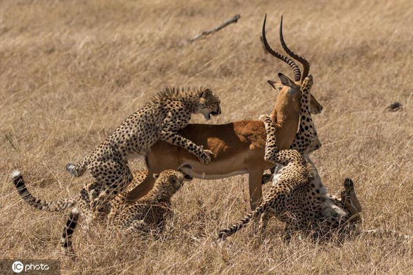 一头黑斑羚遭到五只猎豹的集体狩猎围攻,猎豹多次发起猛烈攻击。其中一只猎豹试图将黑斑羚扑倒但没有成功,而五只猎豹紧紧抓住黑斑羚也没有效果,最后累得筋疲力尽也没有使黑斑羚屈服,黑斑羚成功脱逃。