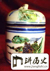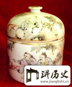 民国筒式套杯,高11厘米、围23厘米,圆盖桃钮,套身绘青花粉彩山水图,一侧及盖以行草书写“可以清心”四字。彩头、画技均不佳,这种被称为“笨拙粉彩”是用一种劣料的技法,民国时期景德镇民窑多用于绘画中下等瓷器。它与以上光绪两品是无法媲美的,录之供初入藏道朋友们参考而已。