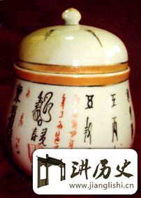 民国鼓式温酒杯,高12厘米、围26厘米,圈足、圆盖、菱形纽。外套以红墨彩书写多体文字,绘图印吉语“百岁多福”,一侧书“博古通今”四字,落款江西出品。