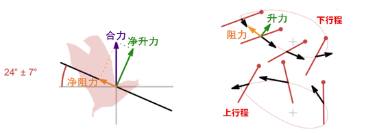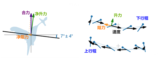 研究者们发现,蜂鸟振翅的上下、前后幅度十分对称,整个振翅周期,翅膀扭转角度和伸缩幅度也较小,优雅轻松地完成了悬停过程。受力分析图显示,蜂鸟翅膀运动时平均倾斜7,比较接近水平面,因此获得的净升力几乎垂直于水平面,可以有效地抵消自身重力。