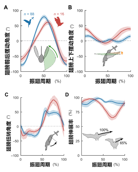 1。 减少阻力。蝙蝠在抬翅时,猛地将翅膀收缩35%(如下图D),减少扇风面积,有效降低了向下的阻力。