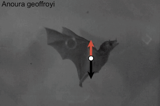 而食蜜蝙蝠的动作显然要夸张许多。由于在抬升翅膀时,来自空气的阻力向下,抬翅获得的升力较少。蝙蝠便减短了抬翅时间,整个振翅周期也不对称(有种猛烈抬起又慢慢放下的感觉)。