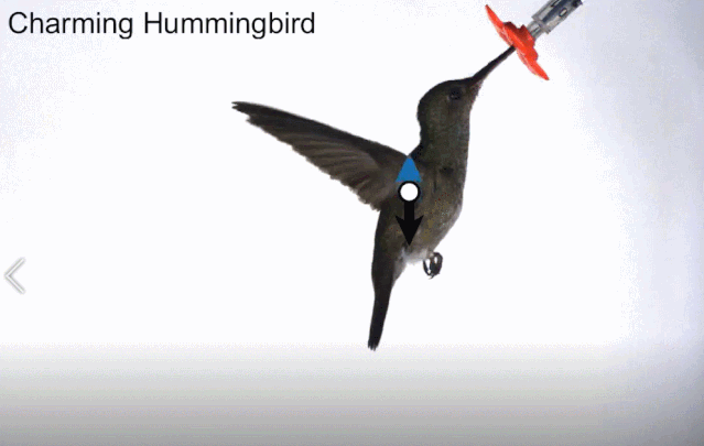 研究者们又给蜂鸟出了点难题:他们改变了花朵的角度。灵动的蜂鸟依然能通过调整身体和头部姿态,保持翅膀和水平面的夹角基本不变(因此获得的净升力也基本不减),轻松应对不同角度开放的花朵。