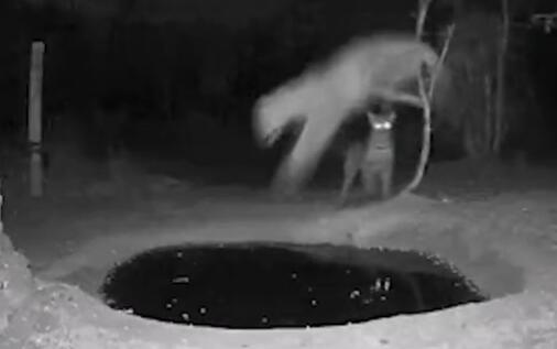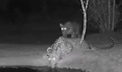 一花园的监控画面捕捉到有趣一幕,一只豹子在水坑旁喝水。然后后面又来了一只豹子。