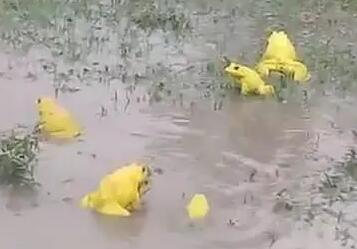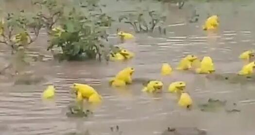 视频拍摄者Parveen Kaswan写道,你们见过金黄色的牛蛙吗?它们是印度牛蛙,在季风季节为了吸引繁殖伴侣,会更改皮肤颜色。看看它们是多么地享受雨水。