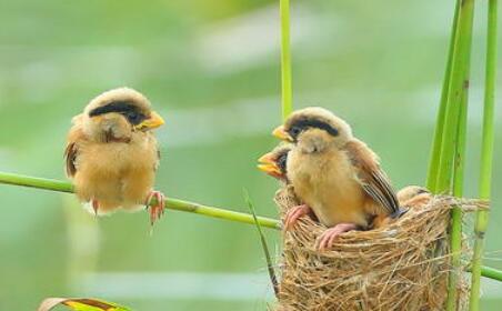 2018年7月4日,在山东青岛白沙河入海口湿地,两只鸟中熊猫震旦鸦雀幼鸟在成鸟带领下开始练飞觅食,标志着青岛入海口湿地成为震旦鸦雀理想的栖息地,种群数量正逐步增加