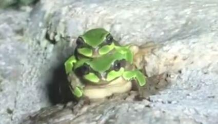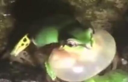 近日,陕西汉中,动物保护人员在秦岭深处拍摄到了难得一见的雨蛙,雄性雨蛙纵声歌唱,外声囊膨胀成球状,画面十分罕见。
