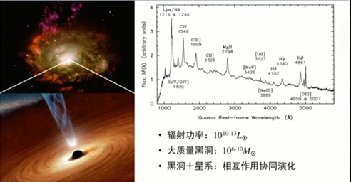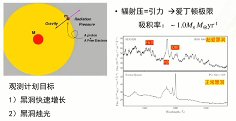 这些黑洞的辐射有何特点?从这张图上我们可以看到这些锯齿状的特征,它们不同于正常的类星体,是铁一价离子的辐射,是超爱黑洞特有的。通过这些特征可以把类星体里面的超爱黑洞找出来研究黑洞吸积的饱和光度和黑洞的快速增长,即它是如何形成超大质量黑洞以及黑洞烛光测量距离。