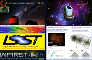 目前国际上对于理解暗能量有哪些观测计划?第一个是从2013年开始的DES(The Dark Energy Survey)计划,由一个四米口径的望远镜位于智利。DESI大型观测计划始于2018年,主要是星系光谱巡天测量BAO。还有美国下一代的WFIRST空间望远镜、欧洲空间局的Euclid,这些望远镜基本上是通过超新星和宇宙的大尺度结构来理解暗能量,或者还通过弱引力透镜来理解暗能量,试图来理解宇宙的膨胀历史。