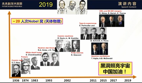 上图是从1936年到今年为止的这样一个天体物理有关的诺贝尔奖获得者排行榜。很遗憾尚未没有中国人。从2011年2016年到2019年,三次诺奖都颁给了天体物理,特别是跟宇宙学和黑洞密切相关。我相信,黑洞能照亮宇宙,解锁更多宇宙奥秘。中国加油!