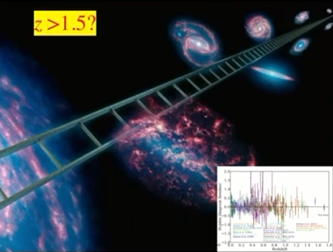 利用超新星的测量宇宙距离时发现,红移大于1.5以后,Ia型超新星的数量就急剧减少,这是恒星演化规律所决定的。宇宙距离的阶梯在红移1.5左右可能就断了,丈量更高红移的宇宙是天体物理学家所面临的一个严峻问题。其中一个流行测量方法是通过重子声波震荡(BAO)的固有长度和张角来测量距离(还有特别是恒星级双黑洞的引力波作为标准铃声)。